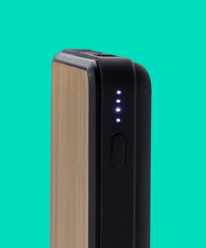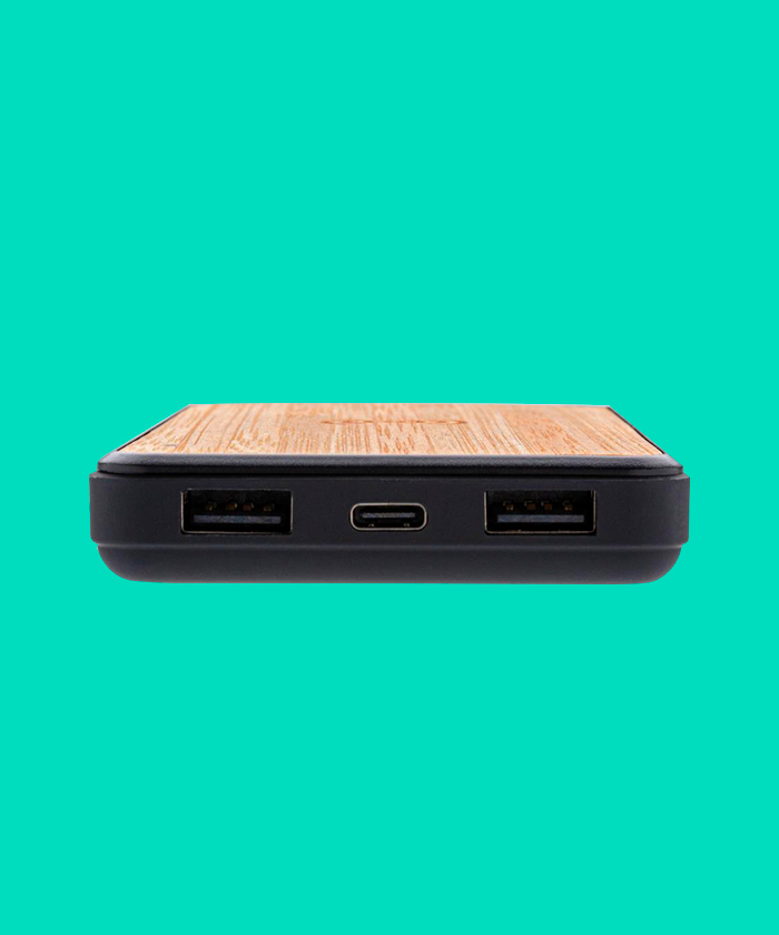 - Powerbank 8000 mAh en bambou naturel et ABS avec finition gomme. Une fois chargée elle permet 4 charges complètes de votre téléphone. L'indicateur de puissance vous indique l'énergie restante et vous permet de savoir quand recharger. Entrée Micro-USB : 5V/2A. Entrée Type-C 5V/2A Sortie USB 5V/2.4A. Sortie induction 5W 5V/1A.