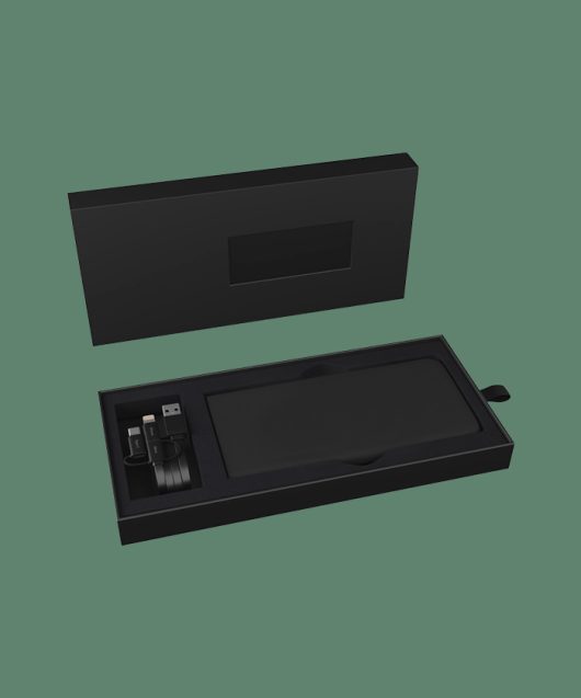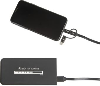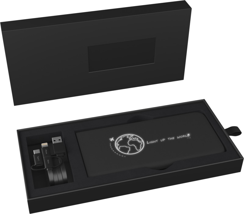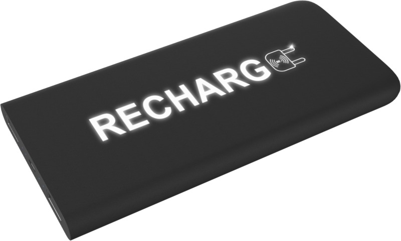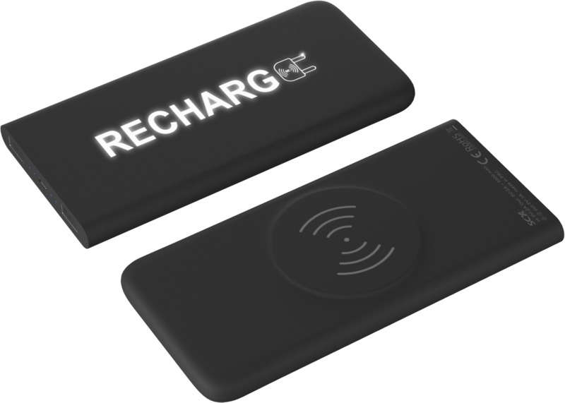 Batterie de secours sans fil en gomme 5 000 mAh avec logo lumineux et câble 3-en-1 en plastique RPET (Type C, Android, iPhone) et traitement anti bactérien. L'appareil s'allume pendant 30 secondes quand on le touche ou quand il est en cours de charge. Capacité : 5000 mAh Entrée : 5 V/2.4 A (micro). Sortie : 5 V/2.4 A (USB). Sortie sans fil : 5 V/2 A max. Fréquence : 110 kHz - 205 kHz. Livrée avec une boîte cadeau en papier recyclé. Gomme, Plastique recyclé PET