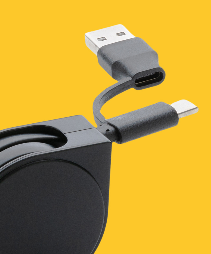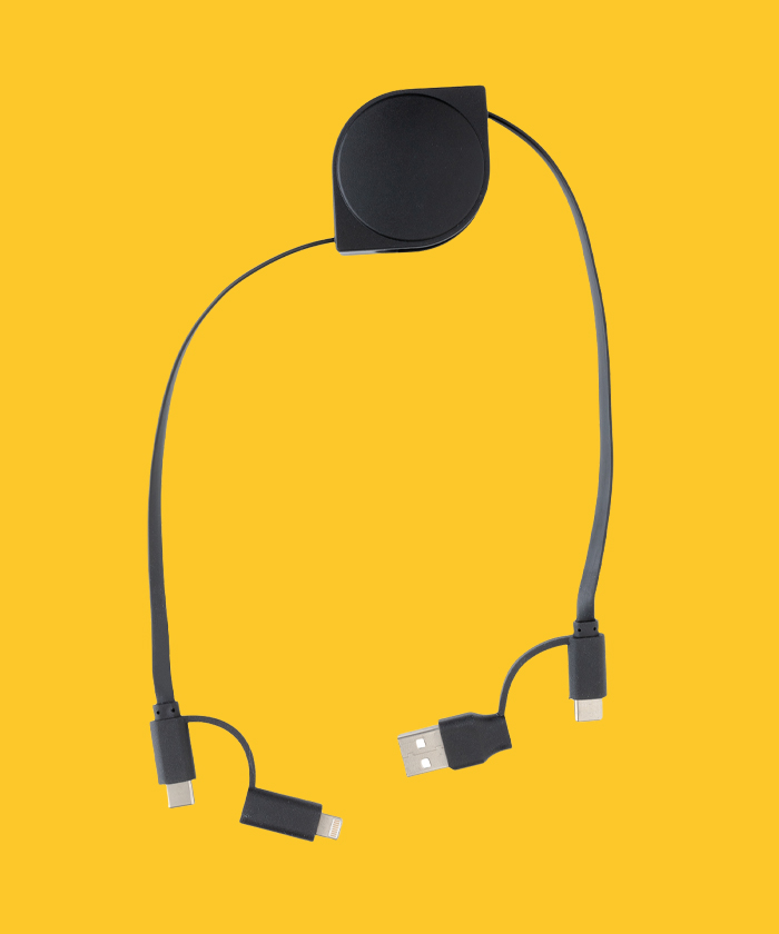 Câble rétractable 6 en 1 dont le boîtier est fabriqué en plastique ABS recyclé certifié RCS et le fil en TPE recyclé