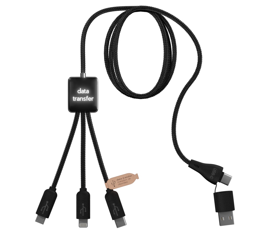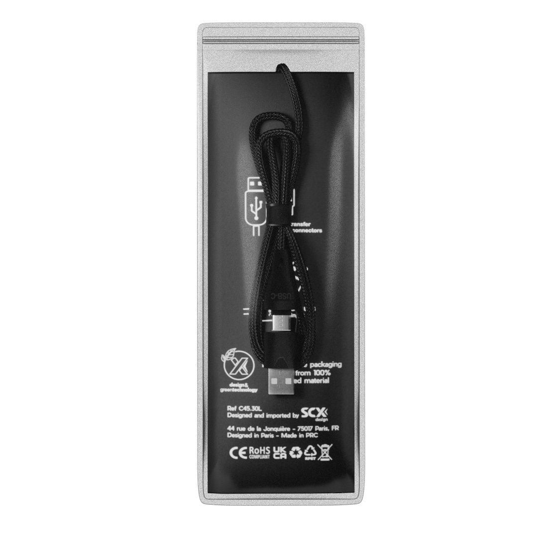 - Câble d'un mètre avec double logo lumineux recto/verso pour type C, iPhone et Android. Les cordons sont fabriqués en rPET (plastique issu de bouteilles recyclées). La double entrée USB-A + USB-C permet au câble d'être universellement compatible avec les derniers modèles d'ordinateurs (MacBook). Le câble permet le transfert de données vers des ordinateurs. Le câble peut également être utilisé avec les téléphones Android pour les applications de type Android Auto OS. Attention, ce câble n'est pas compatible avec Apple CarPlay. Finition métal, rubber soft touch sur l'import / ABS satiné sur le stock. Le câble peut charger plusieurs appareils en même temps. Tout est inclus : personnalisation recto/verso et pochette biodégradable avec cartonnette