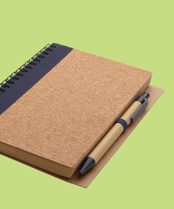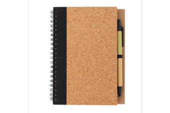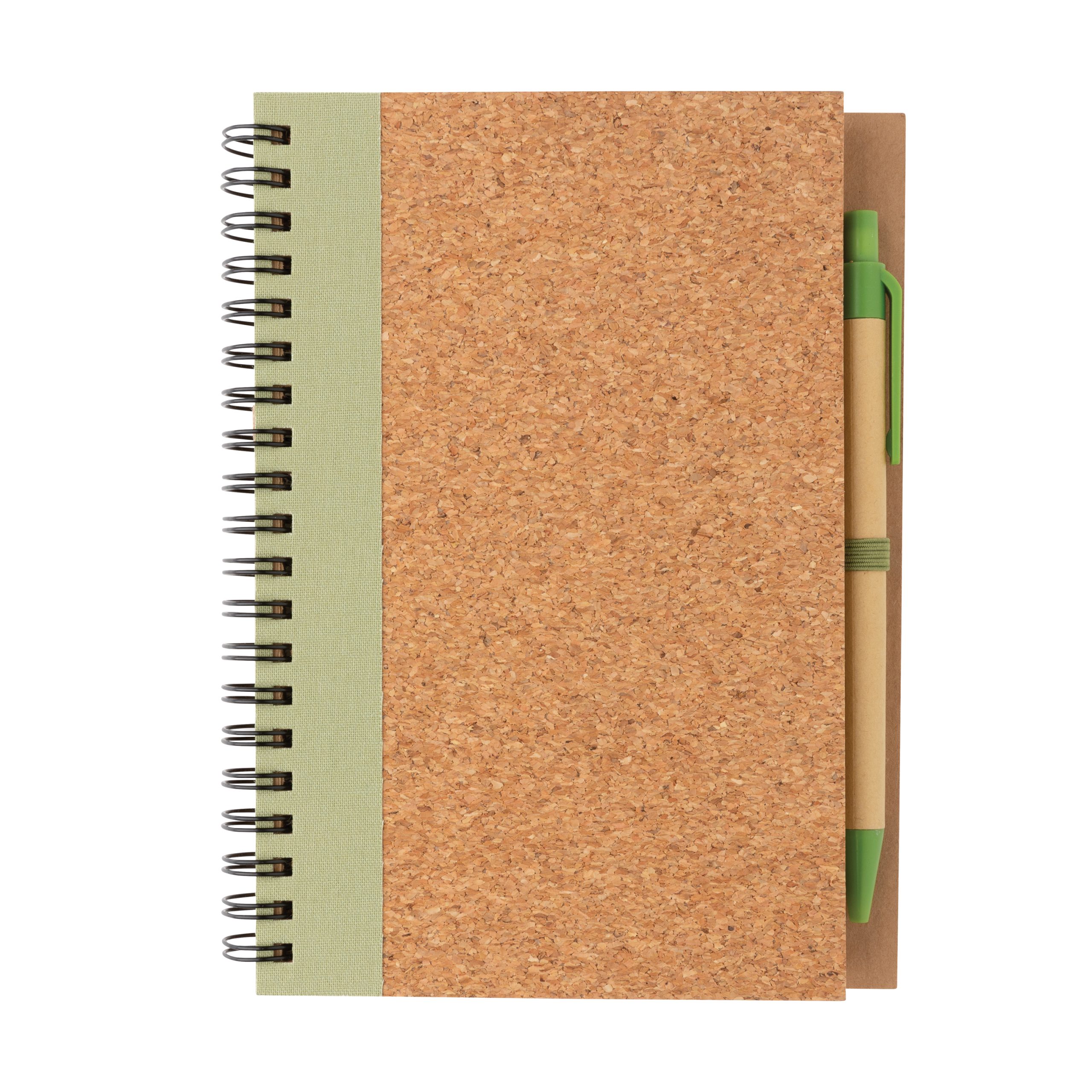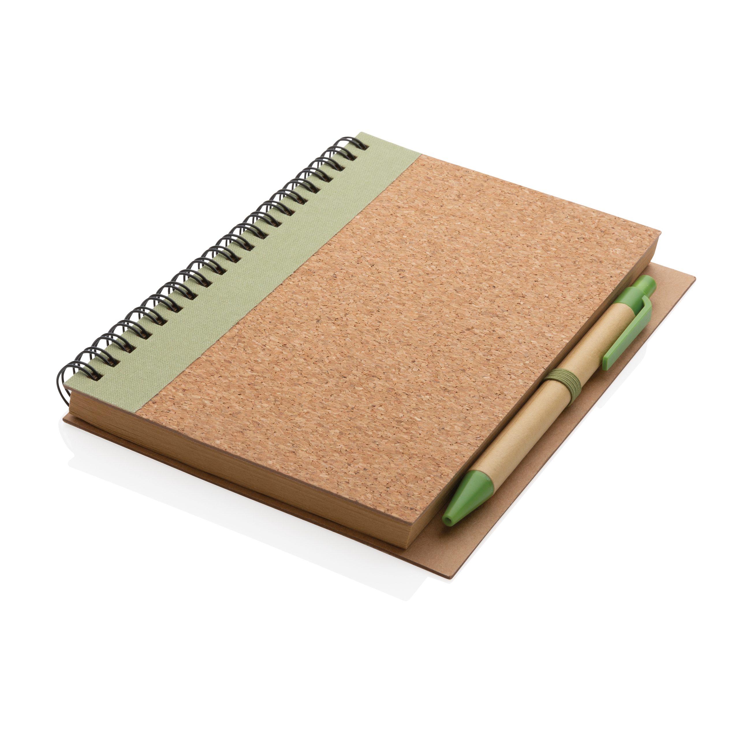 Carnet à spirales avec couverture en liège et stylo à barillet kraft de couleur assortie