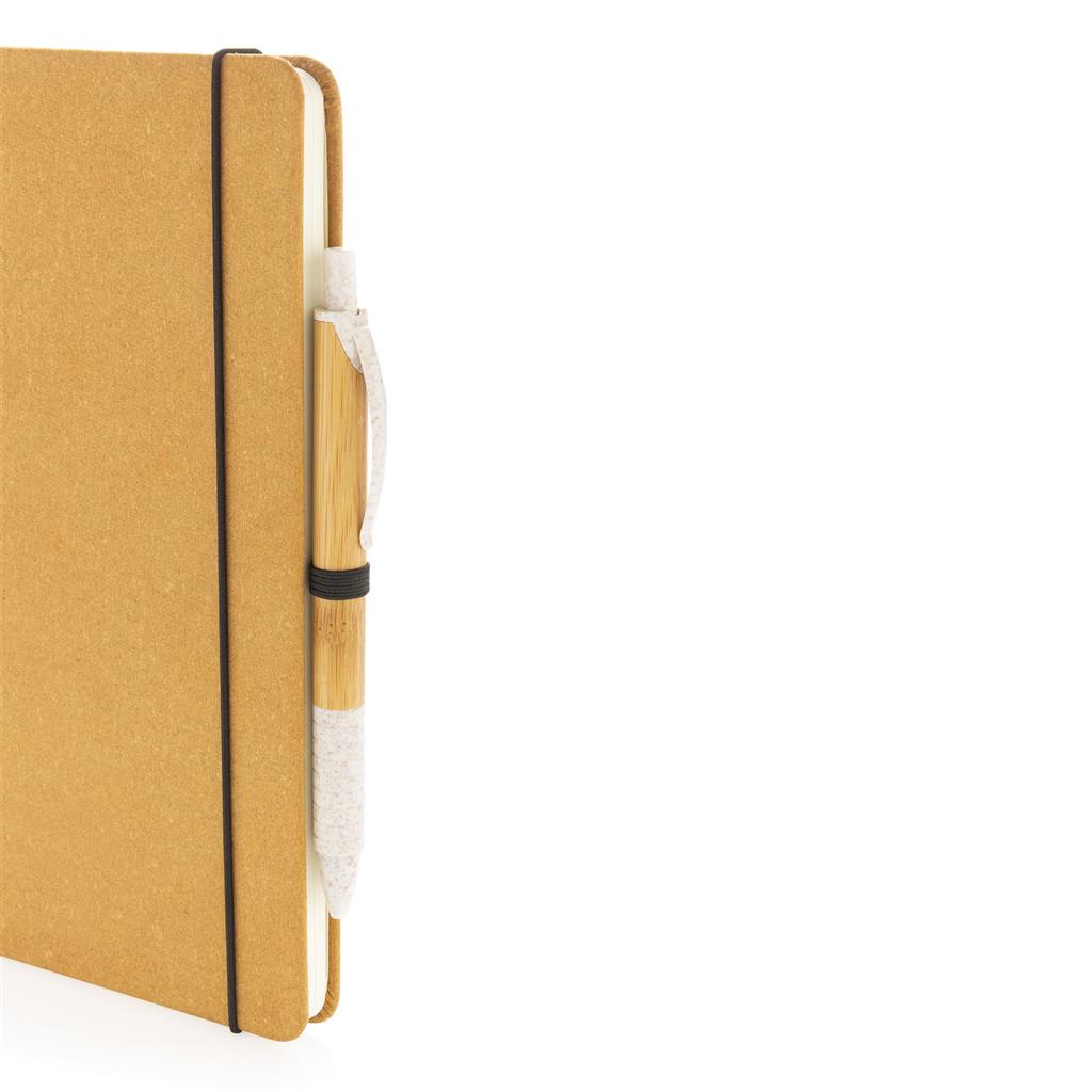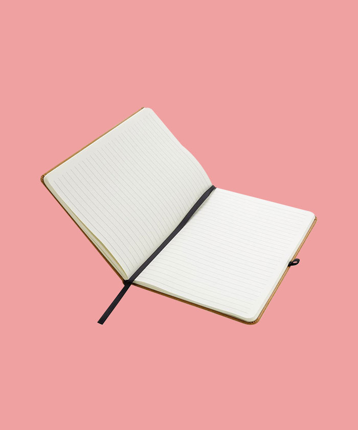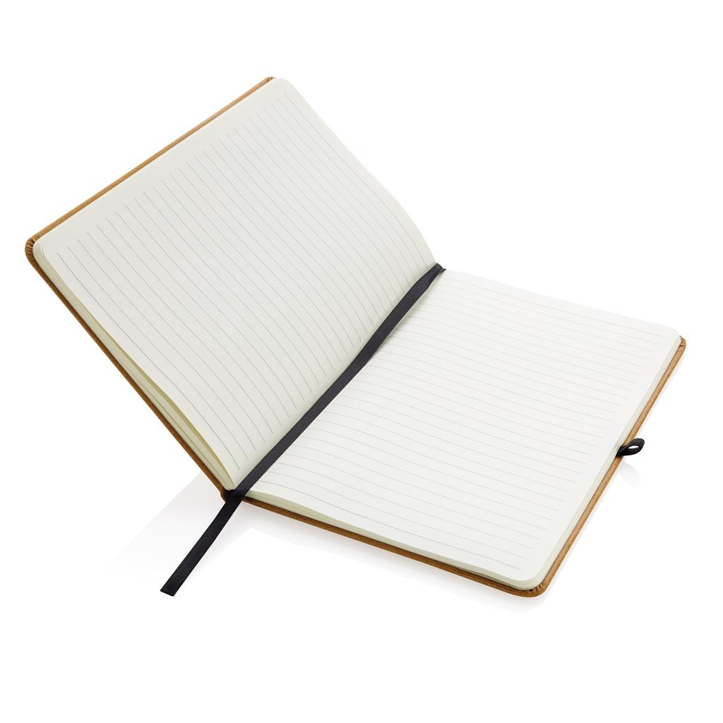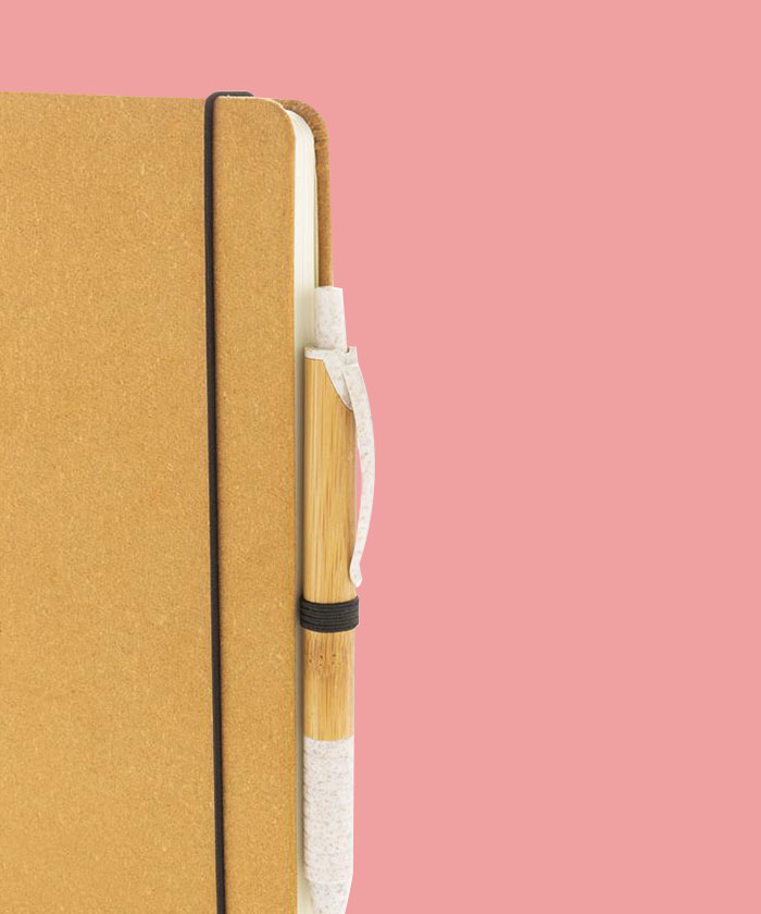 - Carnet A5 en cuir recyclé. Élégant et bien fini avec 80 feuilles/160 pages de 70 g/m2 de papier recyclé ligné de couleur blanche, un élastique vertical et un passant stylo.