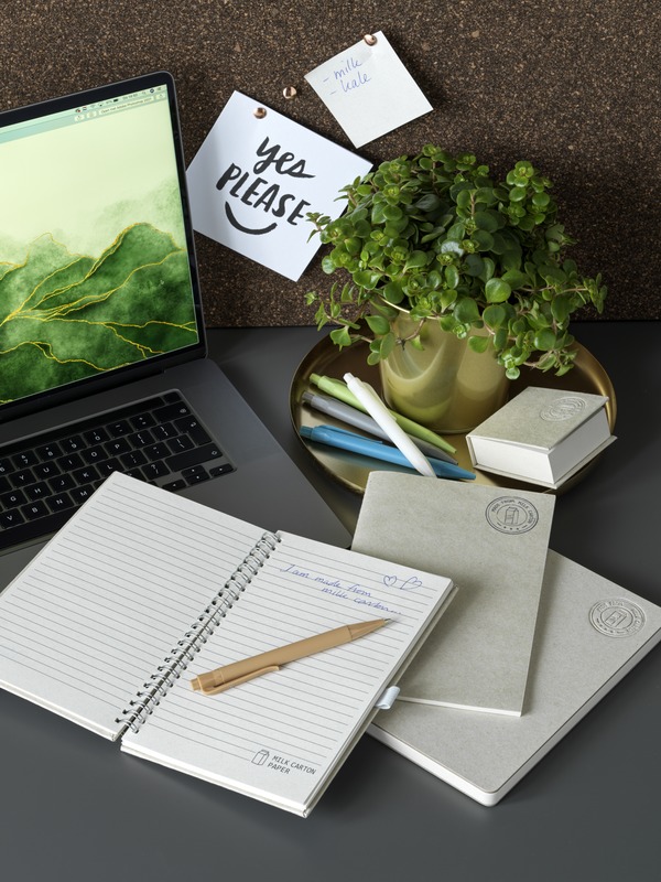 - Carnet de notes à spirales au format A5 avec 70 feuilles lignées de 80 g/m², fabriqué à partir de briques de lait recyclées (jusqu'à 70 %). Les briques de lait usagées sont collectées, triées, traitées et transformées en papier, transformant ainsi les déchets en quelque chose d'utile. Carton recyclé