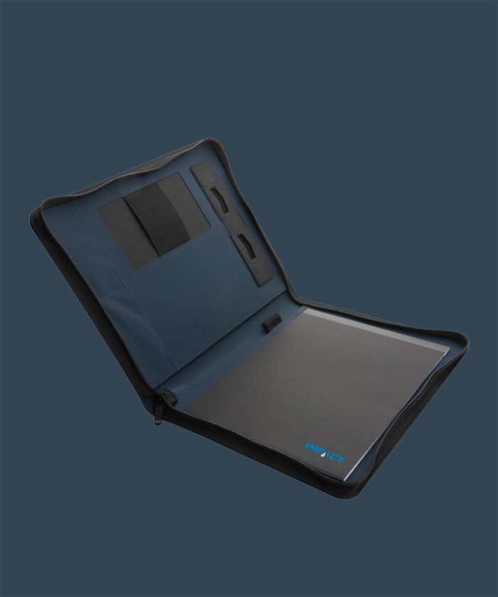 - Conférencier A4 Impact AWARE™ deluxe 300D tech avec fermeture à zip . Gardez vos documents, vos cartes et vos notes ensemble. Un bloc-notes ligné en papier recyclé 64 gm/2 contenant 20 pages. À l'intérieur, il y a 1 poche pour téléphone, un support de téléphone, un passant stylo et 2 fentes pour cartes de visite. Avec le traceur AWARE™ qui valide l'utilisation authentique de matériaux recyclés. Chaque portefeuille économise 4,8 litres d'eau et a réutilisé 8 bouteilles PET de 0,5L. 2% du produit de la vente de chaque produit Impact sera reversé à Water.org. Sans PVC