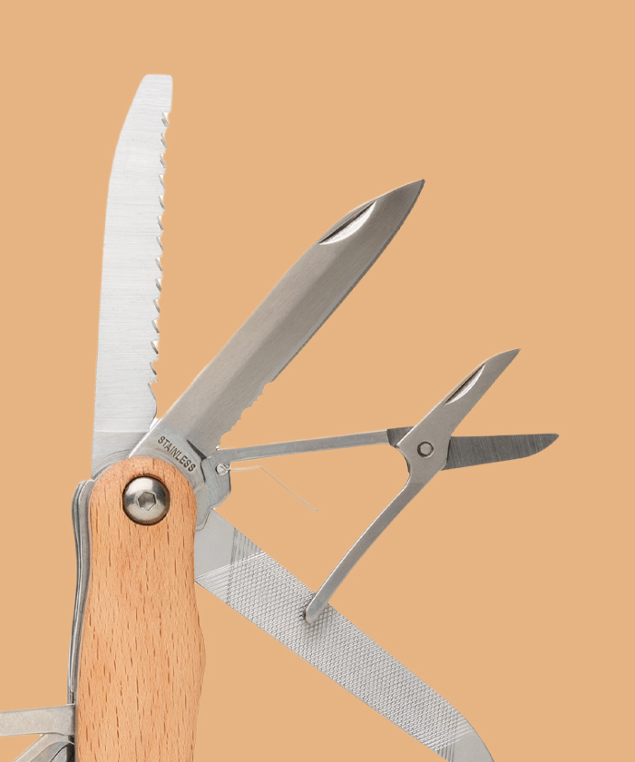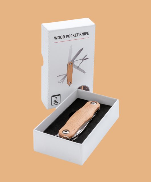 - Couteau de poche compact et robuste en bois de hêtre avec 9 fonctions. Les outils en acier inoxydable sont: Couteau, lame dentelé, ciseaux, lime, scie, dégorgeoir, outil de couture, tournevis cruciforme, tournevis plat. Emballé dans une boîte cadeau