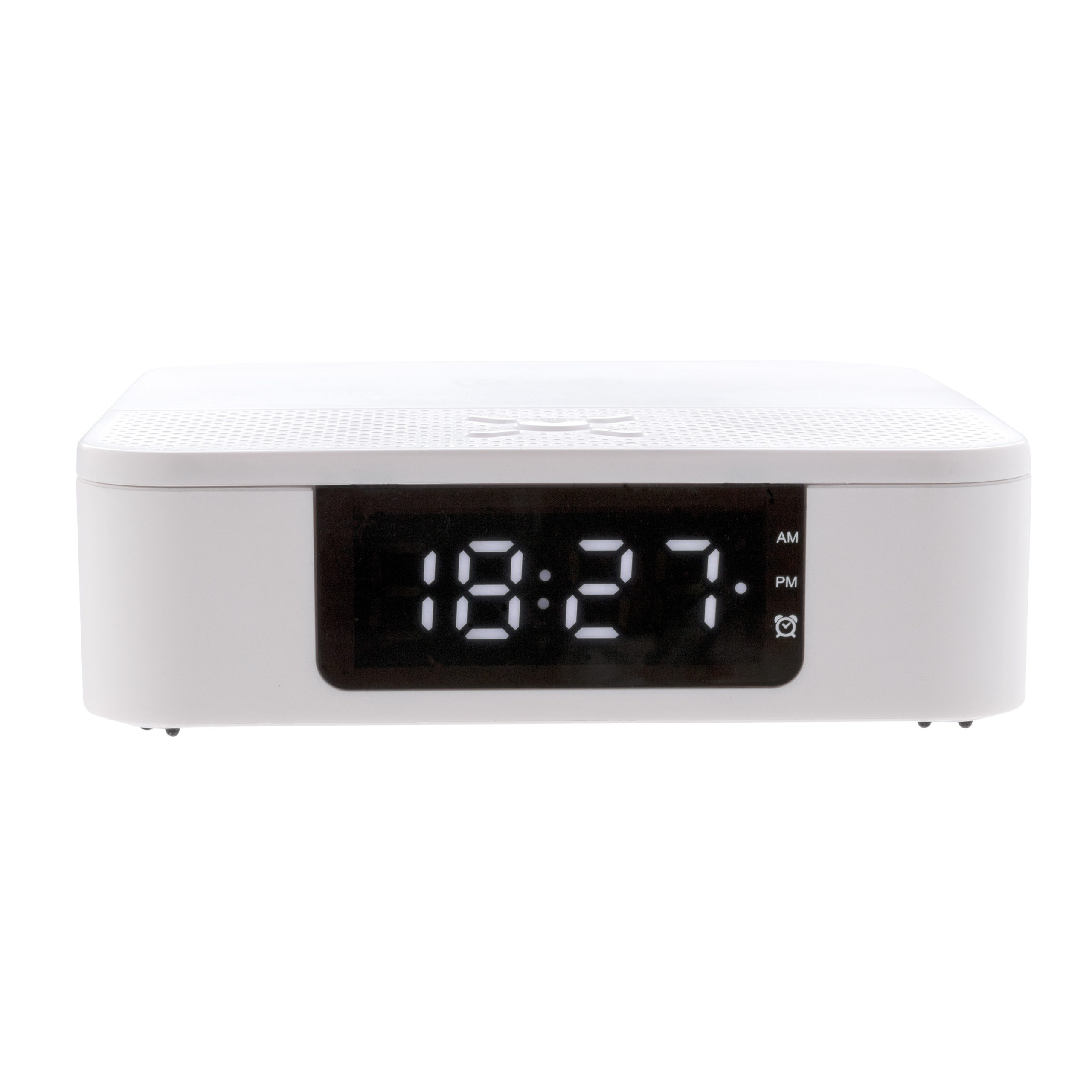 - Haut-parleur 2x3W en ABS avec chargeur à induction 5W et fonction réveil. Batterie de 2000m Ah pour écouter de la musique jusqu’à 6h et charger les téléphones sans câble, connexion BT jusqu’à 10m. Compatible avec dernière génération Android, iPhone 8 et plus. Entrée : 5V 1A. Sortie induction 5V/1A 5W. Câble micro USB de 150 cm inclus.