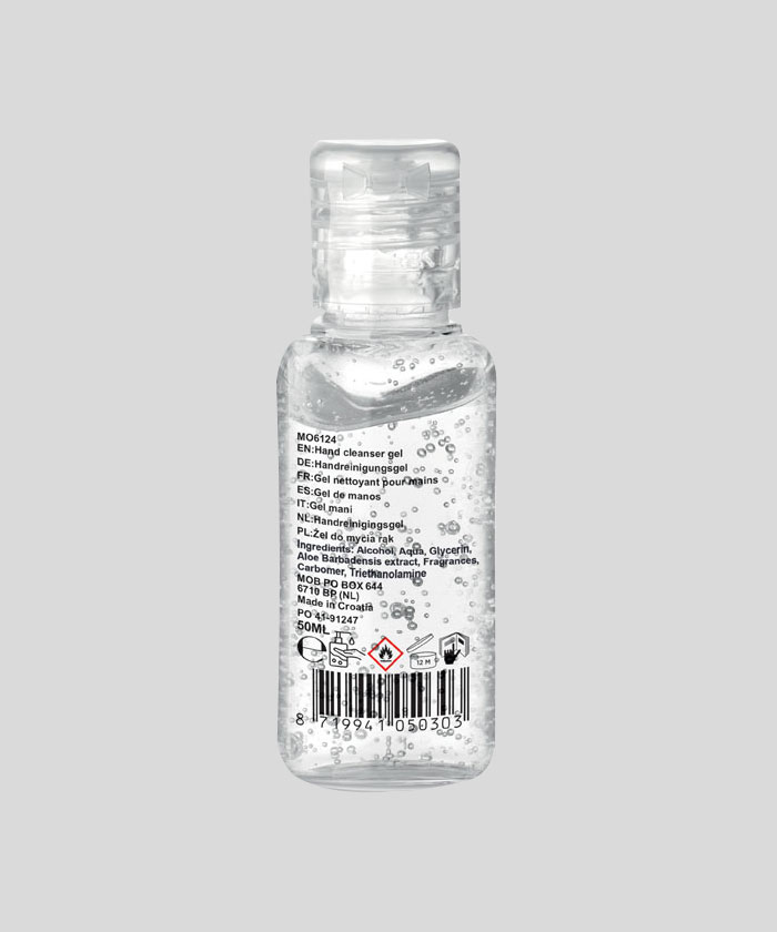 Gel nettoyant pour les mains en flacon PET rechargeable. Capacité 50 ml. Composé à 70% d'alcool. Fabriqué en UE. Cet article est classé dans la catégorie cosmétique