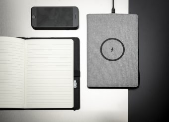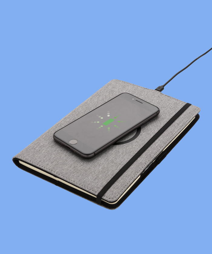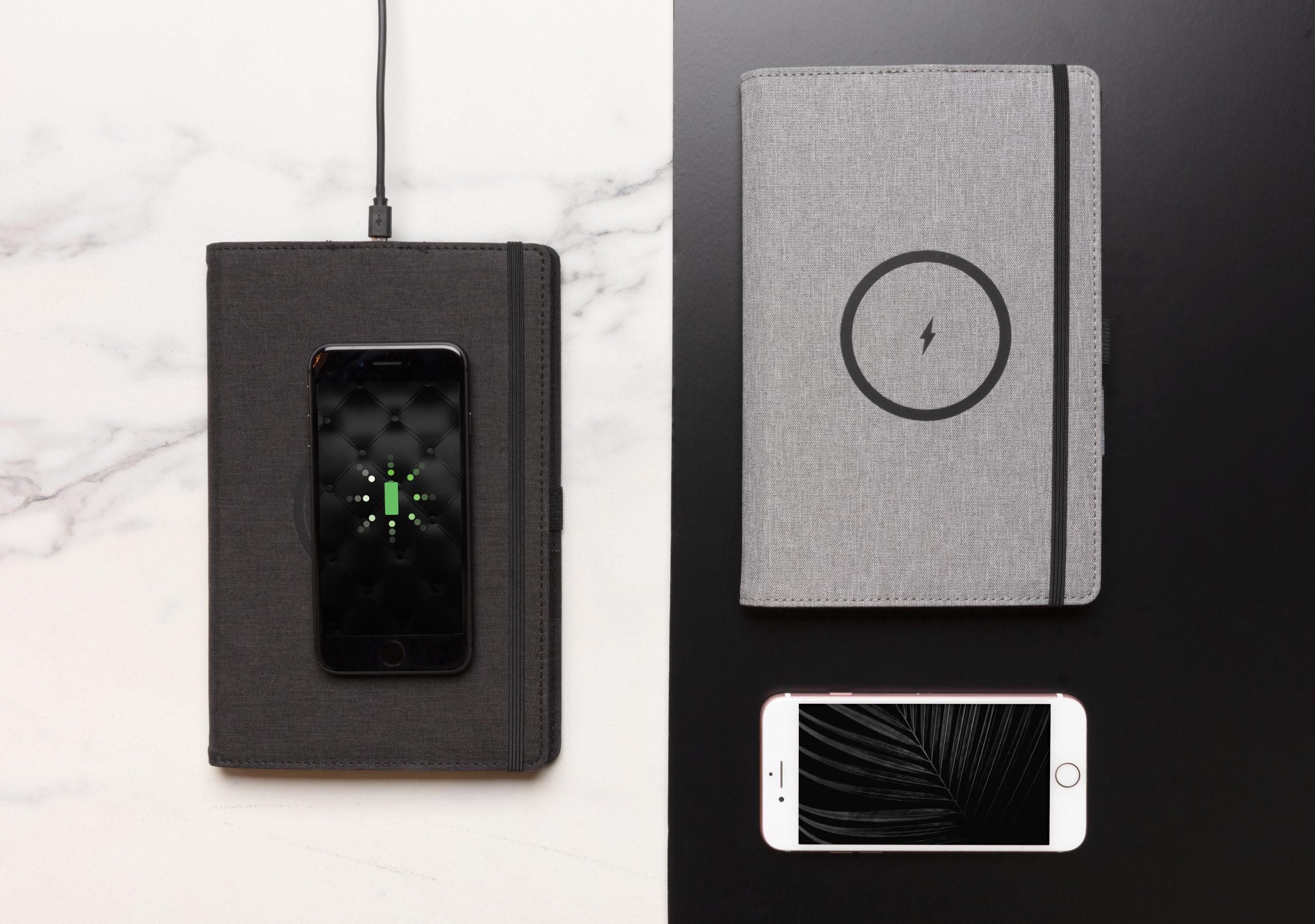 - Conférencier Air 5W . Mettez simplement le téléphone sur le dessus et commencez à charger! Livré avec un câble micro USB de 80 cm pour que vous puissiez vous facilement connecter à n'importe quelle source d'alimentation. Couverture en polyester avec fermeture élastique. Cahier noir en PU souple 80 feuilles / 160 pages de couleur crème lignées de 70g/m2. Entrée: 5V / 2A - Sortie sans fil: 5V / 1A. Modèle déposé®