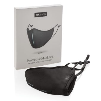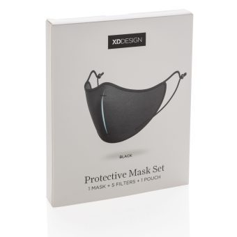Cet ensemble comprend : 1 masque facial réutilisable et lavable, 5 filtres réutilisables, 1 pochette de rangement