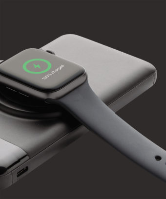 Powerbank multifonction de 10.000 mAh qui peut charger vos appareils mobiles sans fil et également votre Apple Watch via le chargeur sans fil 3W