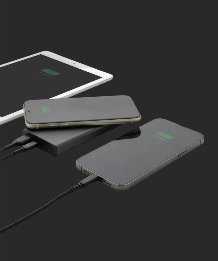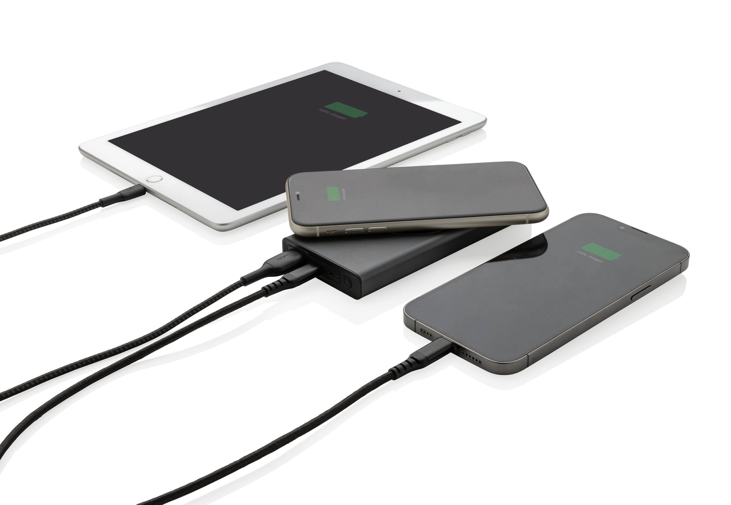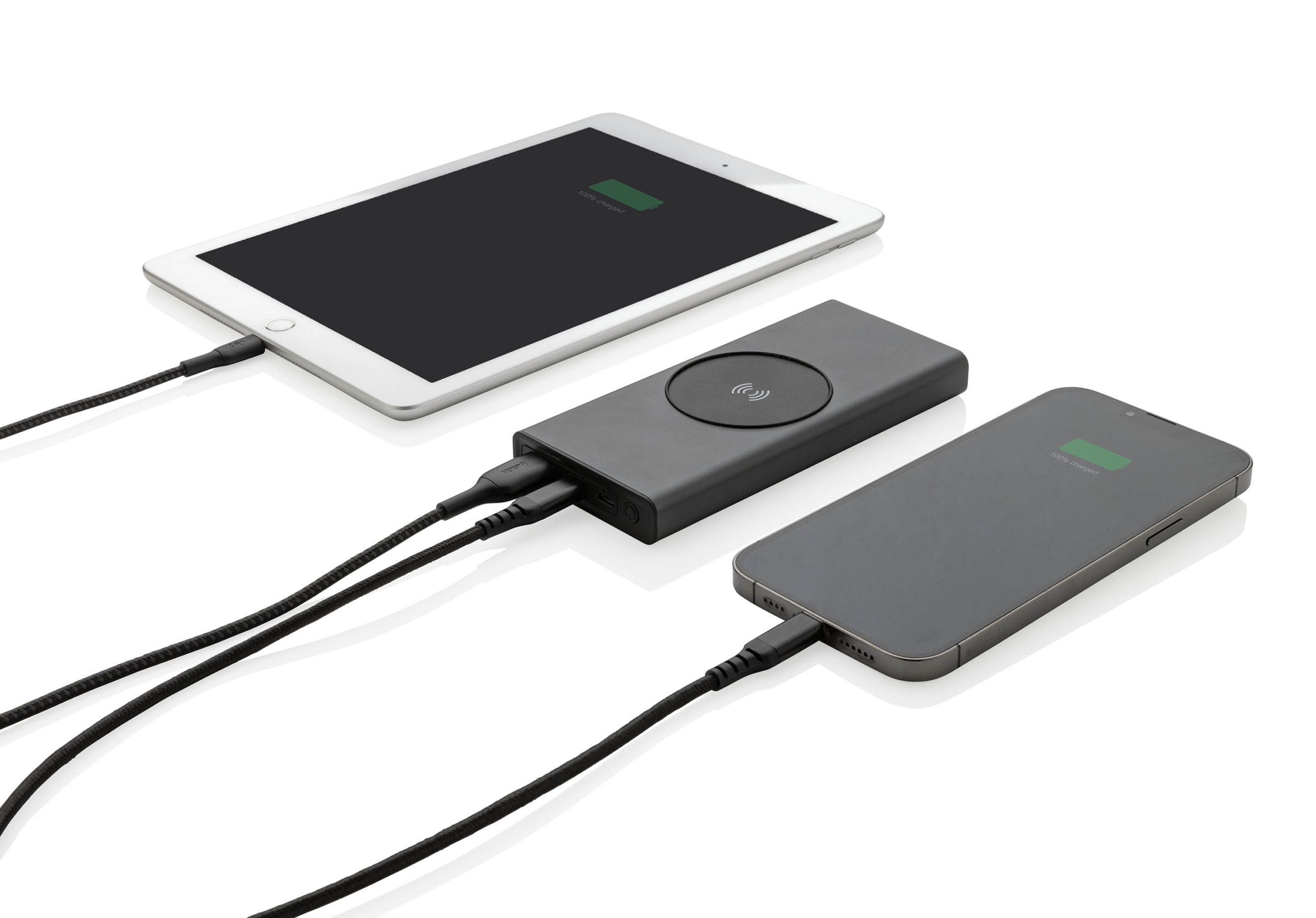 - Contenu recyclé total : 28% sur la base du poids total de l'article. Le port de sortie C prend en charge la charge rapide jusqu'à 18 W et la recharge rapide en 3 heures. Le chargeur sans fil prend en charge la recharge sans fil jusqu'à 10W. Câble de chargement de type C inclus, fabriqué à partir d'aluminium recyclé certifié RCS, de TPE et de PET. Emballé dans un emballage FSC® mix. Sortie USB 5/3A, 9V/2A. 12V/1.5A. Sortie Type C : 5V/3A, 9V/2A, 12V/1.5A. Entrée de type C : 5V/3A, 9V/2A, 12V/1.5A. Entrée Micro USB : 5V/2A, 9V/2A, 12V/1.5A