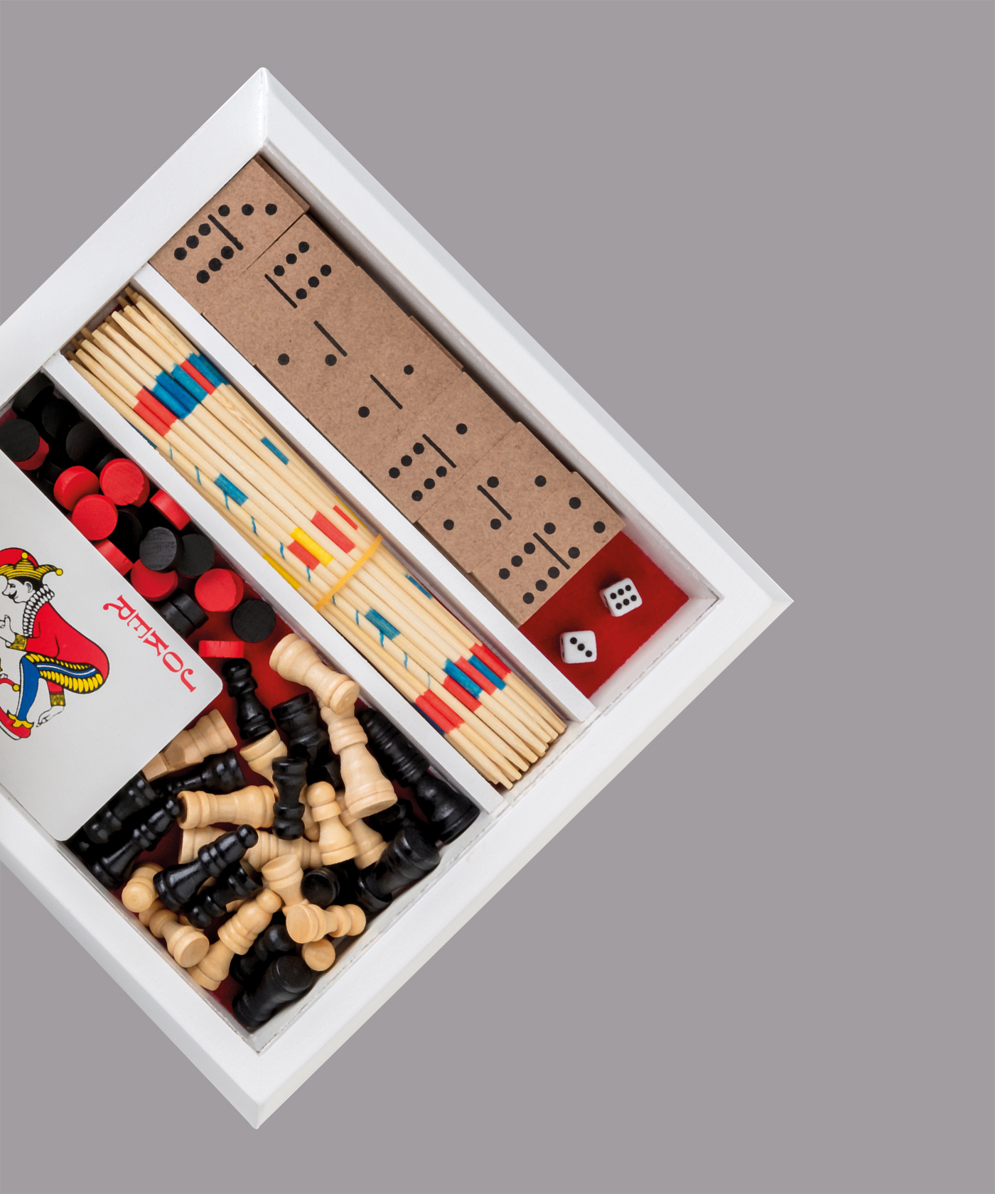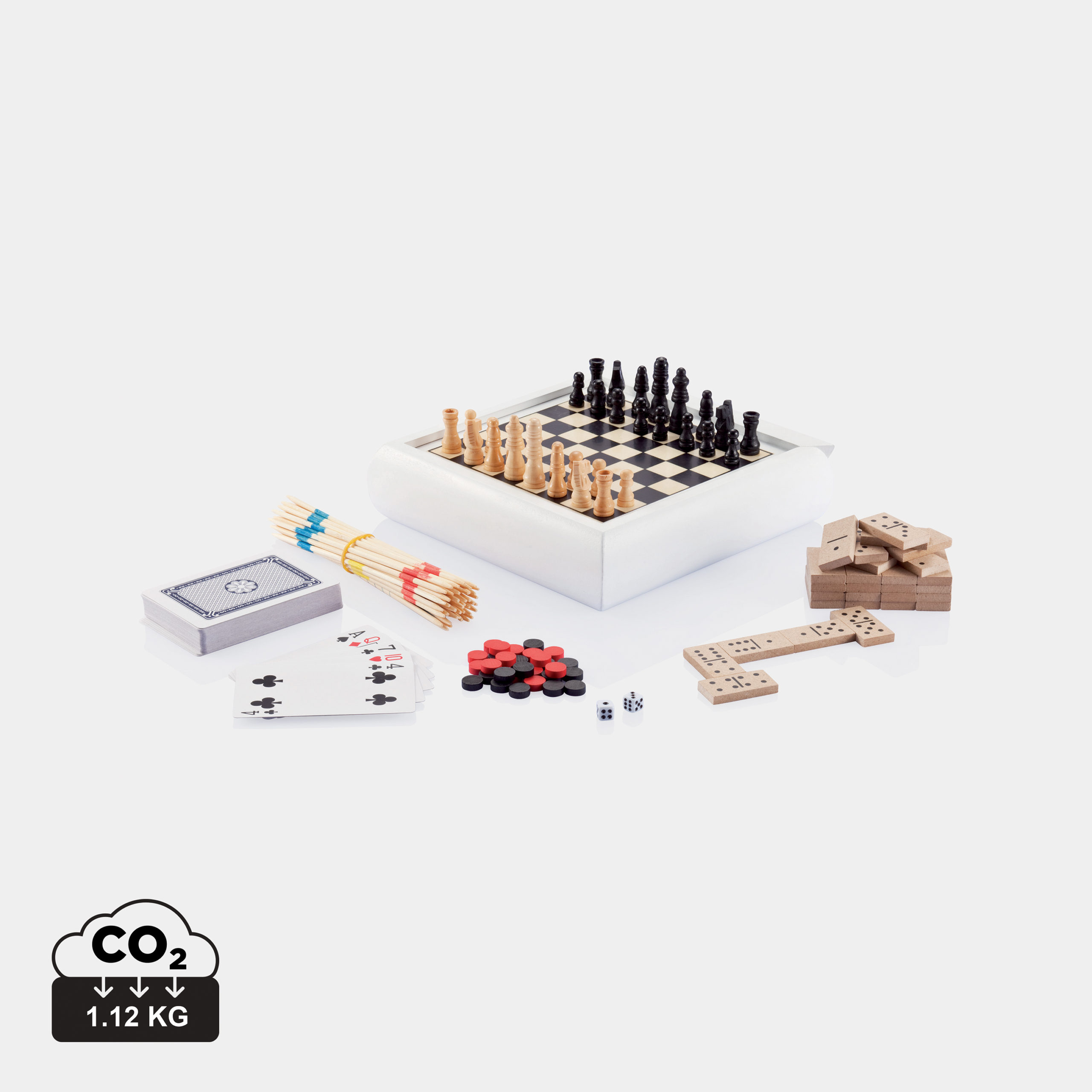 - Profitez d'un moment de jeu amusant avec vos amis ! Ce jeu 5 en 1 comprend : mikado, cartes à jouer, domino, échecs et backgammon. Boîte en bois de pin blanc 17x17x3,7cm avec un échiquier imprimé en noir sur un côté du couvercle et un plateau de backgammon imprimé en noir/rouge sur le fond de la boîte. Fabriqué avec du bois certifié FSC®. Livré dans un emballage cadeau kraft certifié FSC®