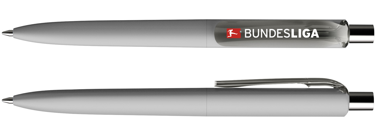 En option : poussoirs en métal satiné ou chromé. Cinq zones d'impression, agrafe imprimable en plusieurs couleurs (jusqu'à six)