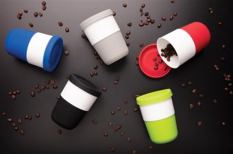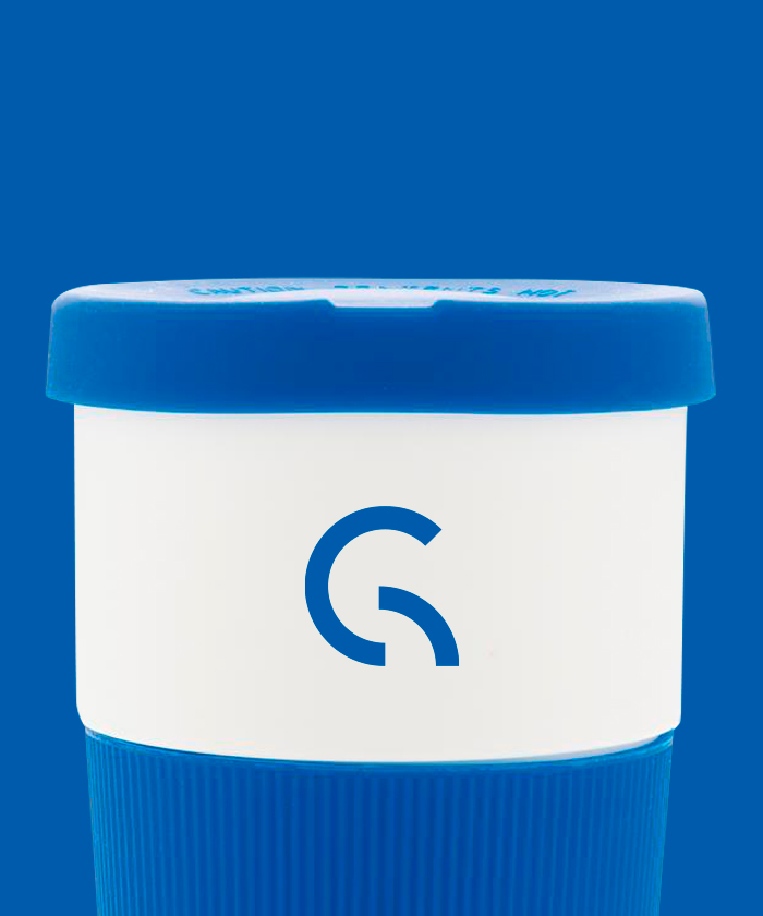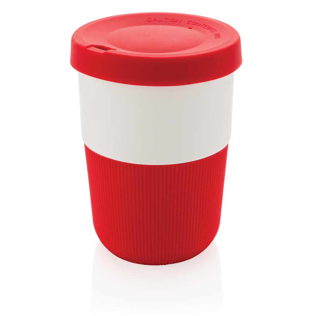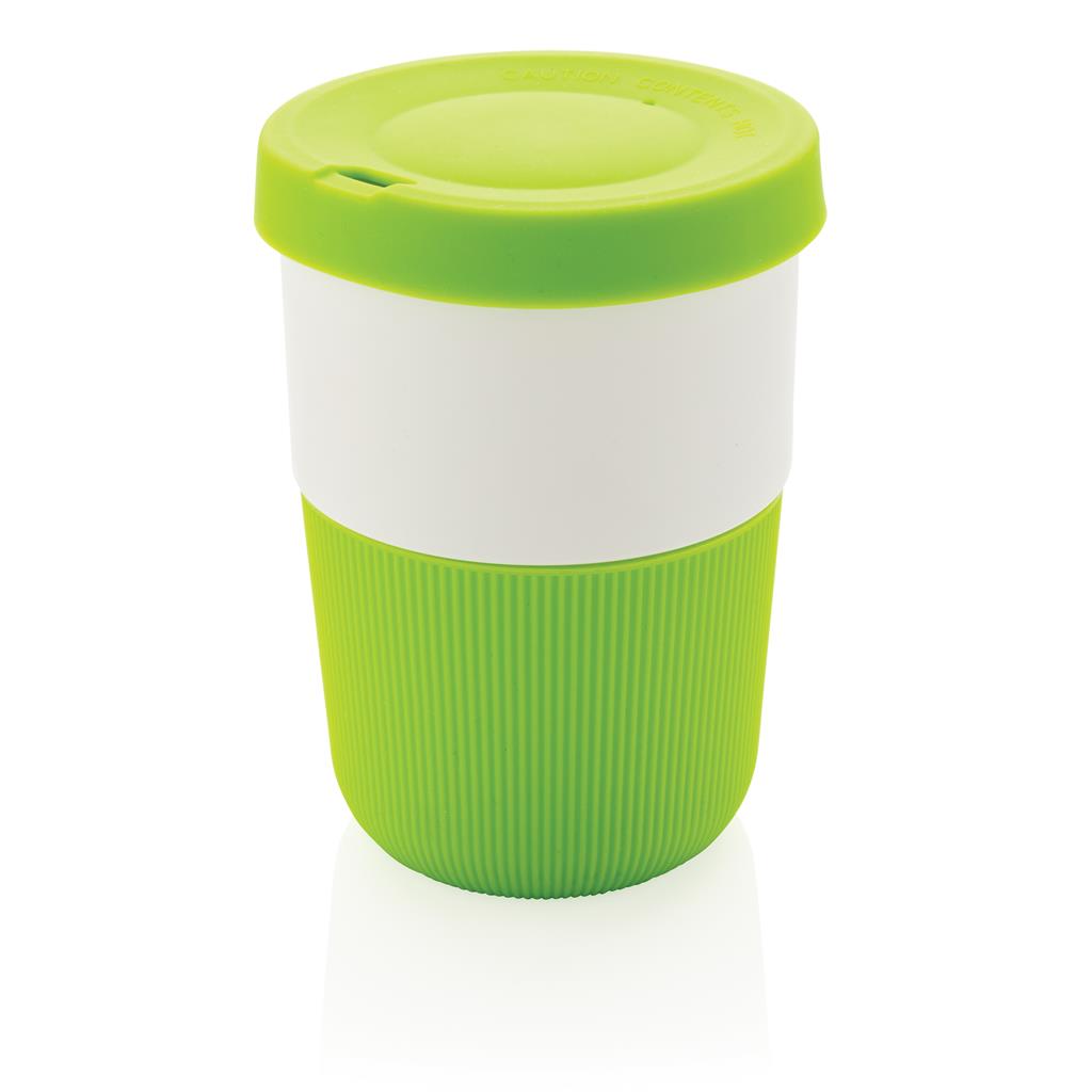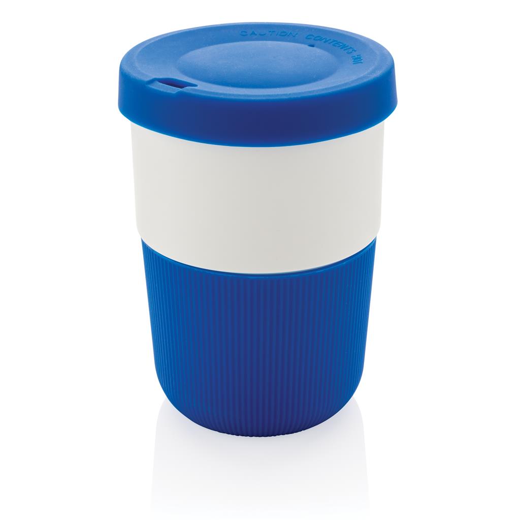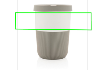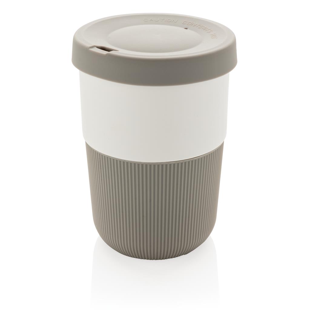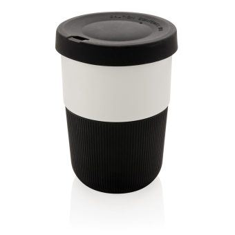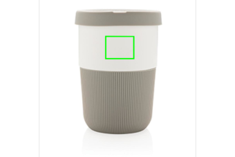 Mug 380ml avec partie blanche en PLA (100% de matériel végétal). Couvercle et bandeau de protection en silicone. 100% sans mélamine. Lavage à la main uniquement